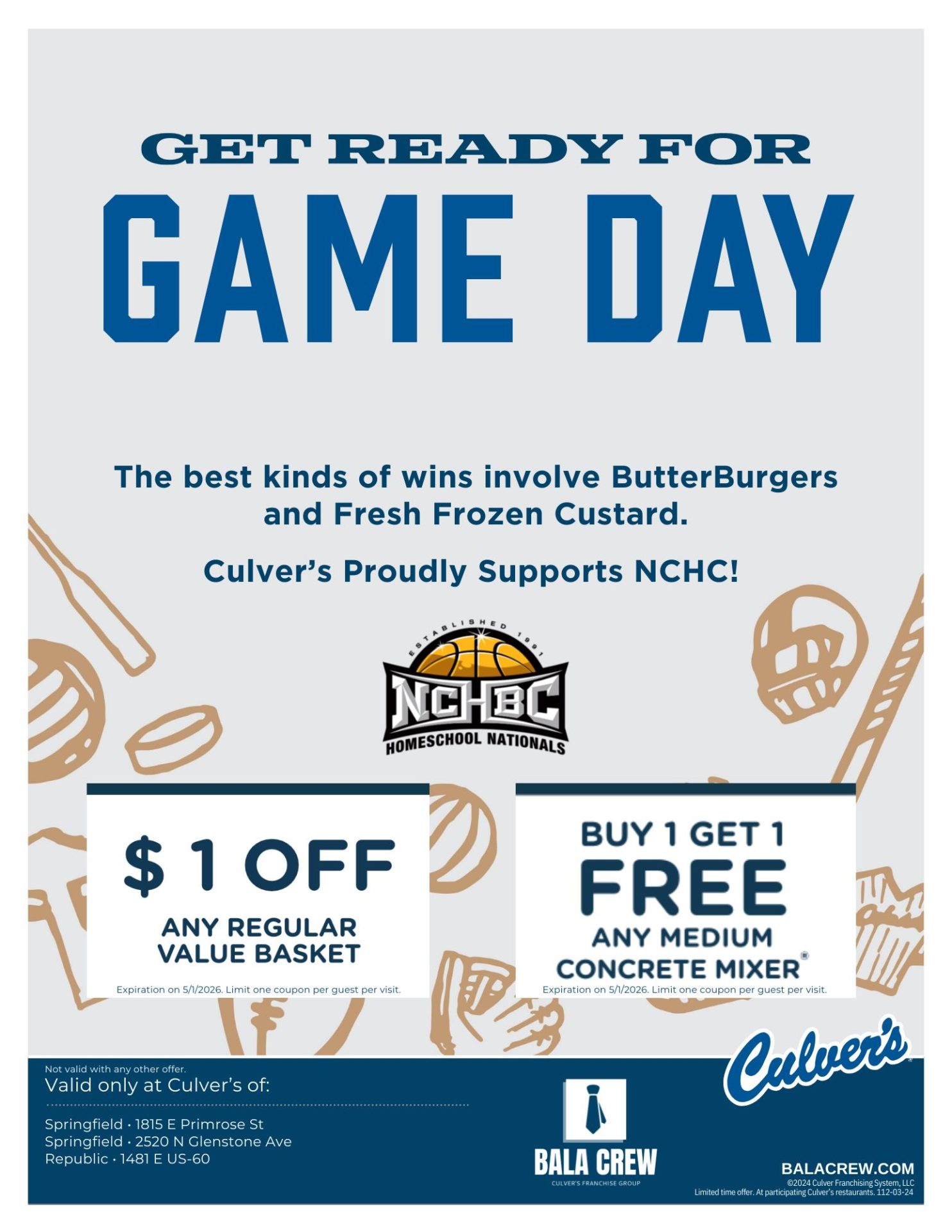 - Culverโs- We’ve never been prouder to be part of this community than we are right now. As an owner and operator of a local business, we are so proud to be a sponsor for the NCHC tournament. On behalf of our team, we appreciate you all visiting. Look forward to serving you all soon. Use this link to get $1 off any Value Basket! CLICK HEREย